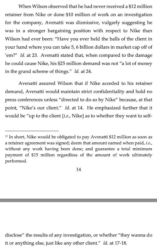 The ruling recounts how Franklin said he didn’t want to harm his former players’ reputations, but Avenatti told Nike’s lawyers, “I don’t give a f--k about those kids,” and said a delay would harm him.