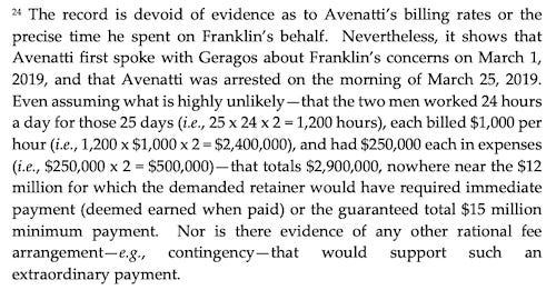 “Even assuming what is highly unlikely—that the two men worked 24 hours a day for those 25 days (i.e., 25 x 24 x 2 = 1,200 hours), each billed $1,000 per hour (i.e., 1,200 x $1,000 x 2 = $2,400,000), and had $250,000 each in expenses (i.e., $250,000 x 2 = $500,000)—that totals $2,900,000, nowhere near the $12 million for which the demanded retainer would have required immediate payment (deemed earned when paid) or the guaranteed total $15 million minimum payment. Nor is there evidence of any other rational fee arrangement—e.g., contingency—that would support such an extraordinary payment.”