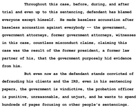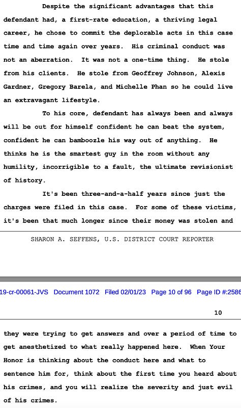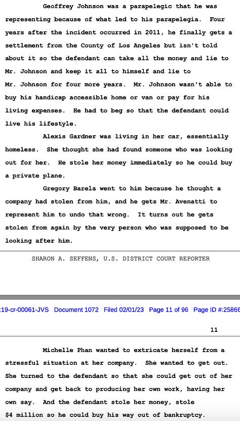 I realized when putting together this article that the transcript from Avenatti’s Dec. 5 sentencing is now available in PACER, so I downloaded it solely to screenshot Assistant U.S. Attorney Brett Sagel’s decisive summary of Avenatti’s overwhelming fraudulence. This is for all the people who act like he was a serious lawyer who lost his way.