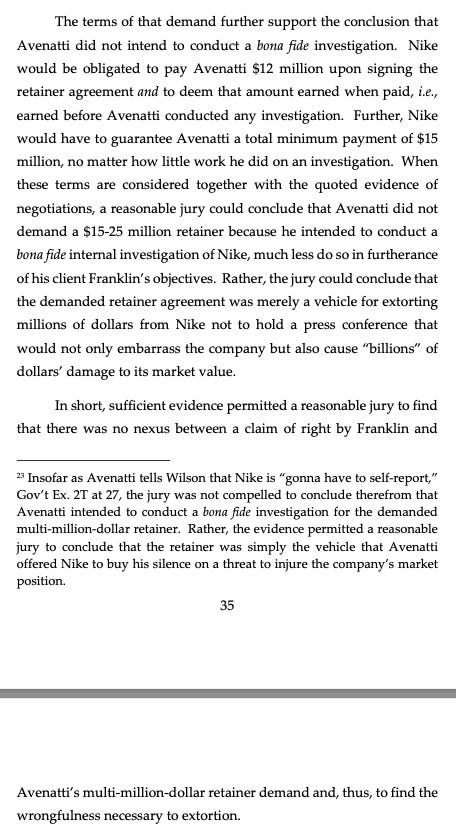 Wednesday’s opinion distinguishes Jackson’s case by noting that the jurors who convicted Avenatti were properly instructed, so the only thing to consider on appeal is whether “any rational jury could find wrongfulness on the evidence presented viewed in the light most favorable to the prosecution.” It says a reasonable jury concluded Avenatti had no right “to a personal payment from Nike, let alone to a $15-25 million payment as distinct from a $1.5 million payment to his client Franklin.”