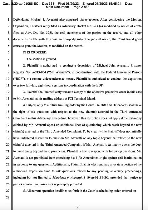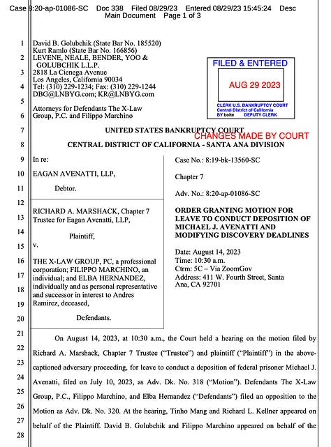 The ruling comes as lawyers for the trustee for Avenatti’s bankrupt law firm are preparing to take his deposition in an adversary action against his former law partner Filippo Marchino and Marchino’s The X-Law Group.