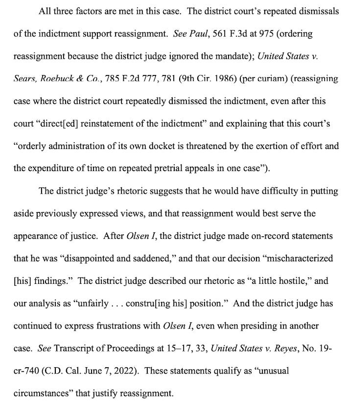Prosecutors appealed, and their February 2023 opening brief took the rare step of asking the 9th Circuit to order the Central District’s chief judge to assign a different judge to the case.