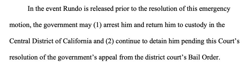 Prosecutors’ emergency motion asked the 9th to specify Rundo can be arrested and detained. They made the request amid complaints from Rundo’s public defenders and Judge Carney that the DOJ unlawfully arrested Rundo in February after Carney dismissed his indictment and declined to stay the order pending 9th Circuit review.