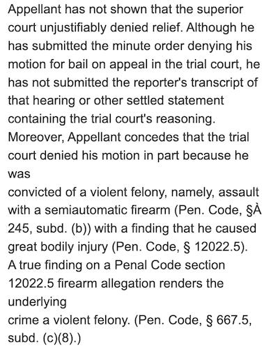 “Appellant has not shown that the superior court unjustifiably denied relief. Although he has submitted the minute order denying his motion for bail on appeal in the trial court, he has not submitted the reporter’s transcript of that hearing or other settled statement containing the trial court’s reasoning. Moreover, Appellant concedes that the trial court denied his motion in part because he was convicted of a violent felony, namely, assault with a semiautomatic firearm (Pen. Code, §À 245, subd. (b)) with a finding that he caused great bodily injury (Pen. Code, § 12022.5). A true finding on a Penal Code section 12022.5 firearm allegation renders the underlying crime a violent felony. (Pen. Code, § 667.5, subd. (c)(8).”