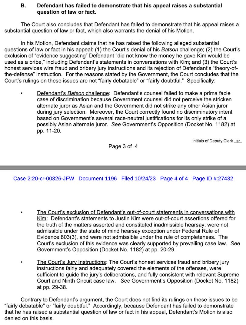 So was Lee, the developer convicted of bribery and falsifying records, but unlike Ridley-Thomas, prosecutors opposed Lee’s bail request because they argued he was a risk to flee the country. They also said he hasn’t shown that his appeal is intended to delay.