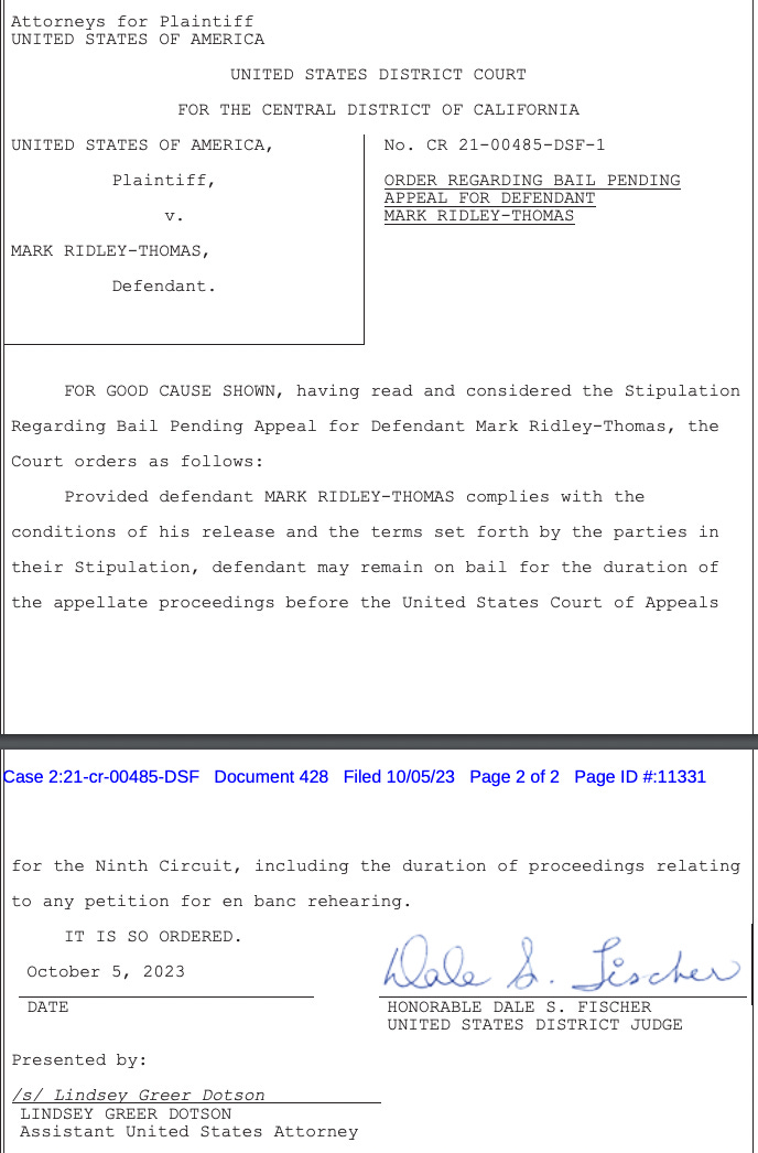 In the other, federal prosecutors agreed Los Angeles politician Mark Ridley-Thomas should be allowed to remain free on bail as he appeals his convictions for a bribery scheme involving the University of Southern California. U.S. District Judge Dale S. Fischer signed the order on Oct. 5.