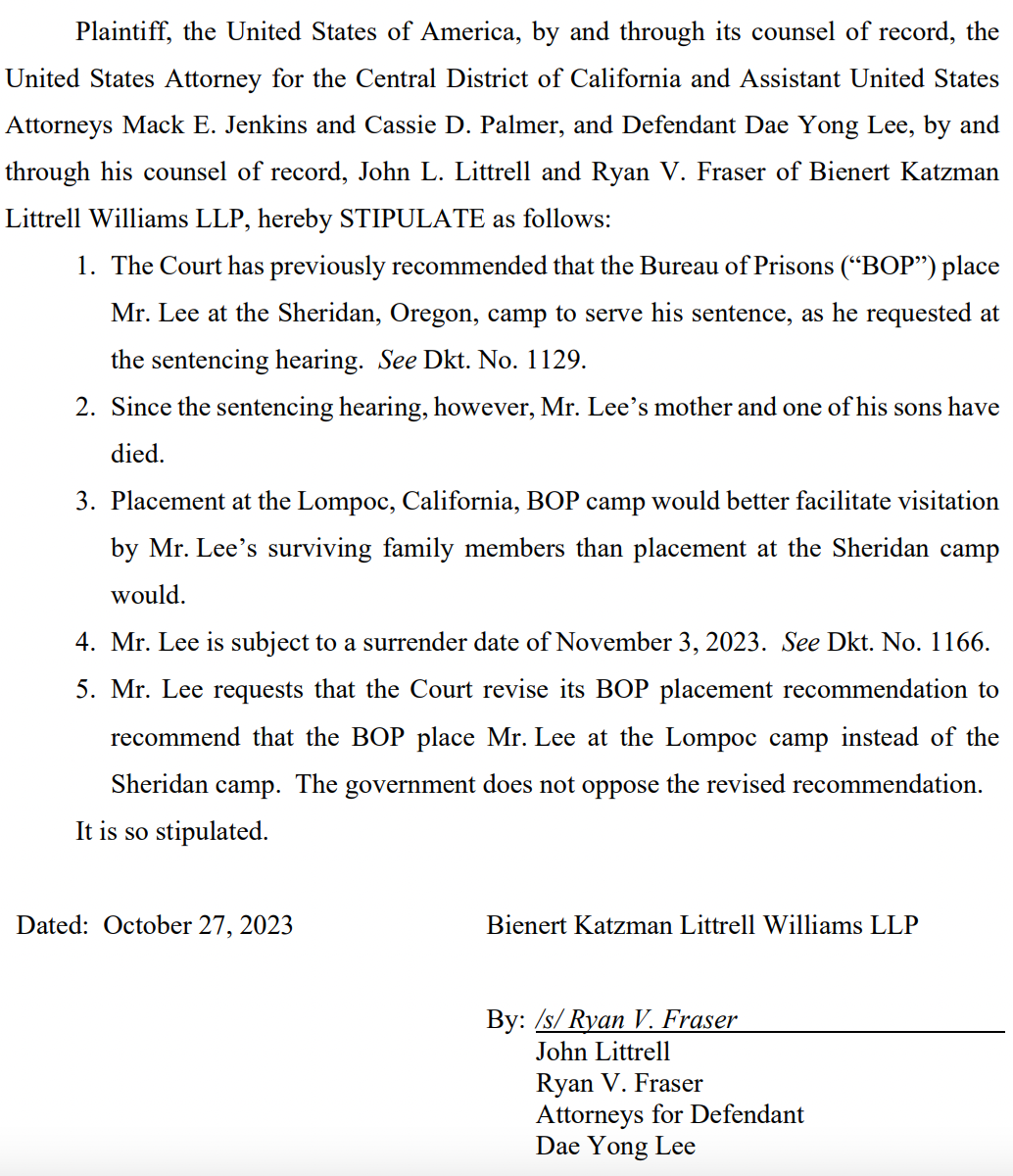 In September, Judge Walter delayed Lee’s surrender date a month to allow him to file a motion for bail pending appeal. Lee was represented by Ariel Neuman and Ray S. Seilie of Bird, Marella, Boxer, Wolpert, Nessim, Drooks, Lincenberg & Rhow, P.C., during trial and post-conviction proceedings, but he replaced them with John Littrell and Ryan V. Fraser of Bienert Katzman Littrell Williams LLP after sentencing.