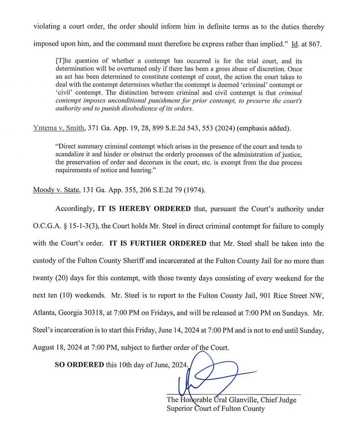 The judge called a “5-minute recess” to consider criminal or civl contempt, then returned an hour later, declared Steel to be in criminal contempt and sentenced him to 10 weekends in jail.
