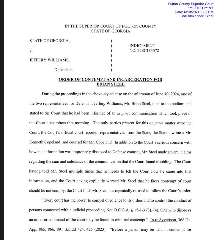 Glanville formally held Steel in “summary criminal contempt” about 7:30 p.m. eastern time after hearing from his attorneys, Ashleigh Merchant and Alex Susor, but didn’t jail him on the spot and instead imposed the 10 weekend sentence. Steel asked if he could “be with Mr. Williams and we work on our case all weekend for all those weekends.”