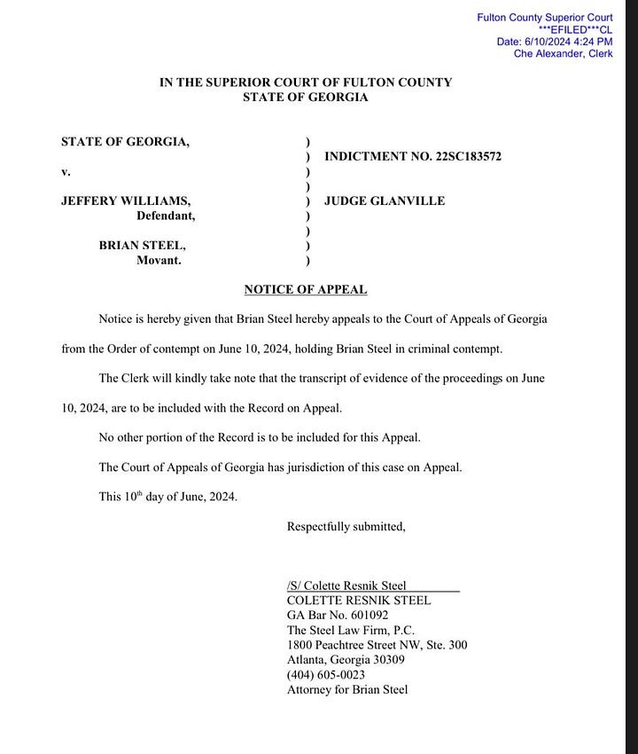 Steel is appealing Glanville’s order and seeking bond. His wife and law partner, Colette Resnick Steel, filed a notice of appeal Monday afternoon, along with a motion for bond.