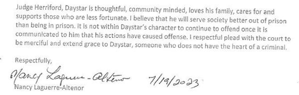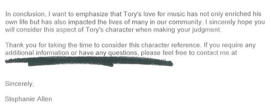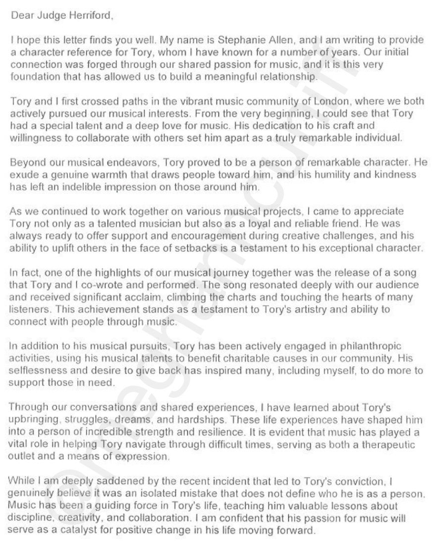 Don’s letter said she’s “deeply saddened by the recent incident that led to Tory’s conviction” but she believes “it was an isolated mistake that does not define who he is as a person.”