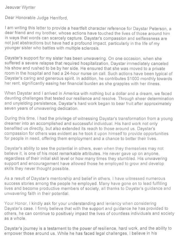 Mario, the R&B singer who submitted a letter under his full name, Mario Barrett, said he’s “never seen Tory act out of character in a manner to hurt someone.”