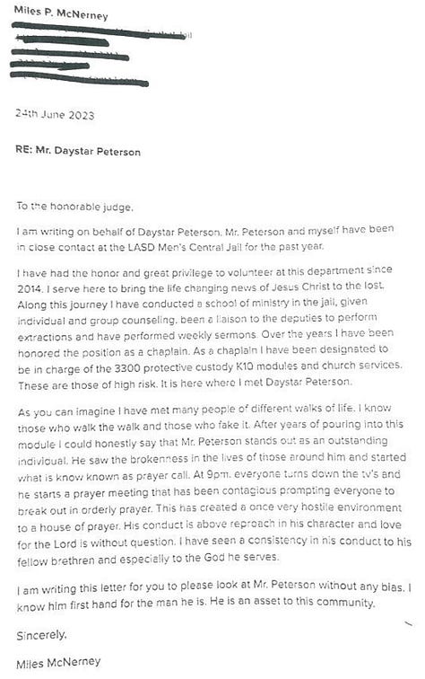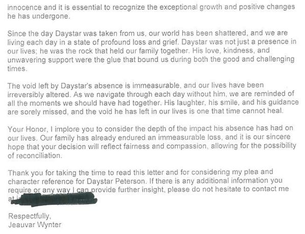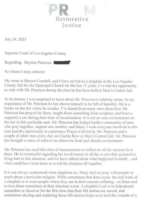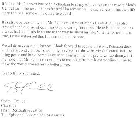 “Mr. Peterson has used this time of incarceration to reflect on all the reasons he is there. He is remorseful regarding his involvement in all the events that occurred to bring him to this situation, and we have talked about what happened in detail … and what could have been done to avoid the situation all together,” Crandall wrote.