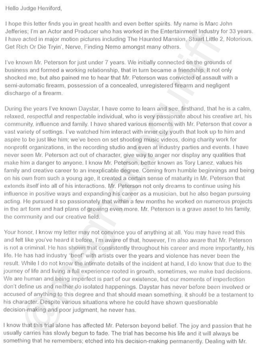 Lanez’s father, Sonstar Peterson, did not write a letter, but he spoke to Herriford in person last week. He detailed the death of Lanez’s mother and also apologized for his huge courtroom outburst after the verdict.