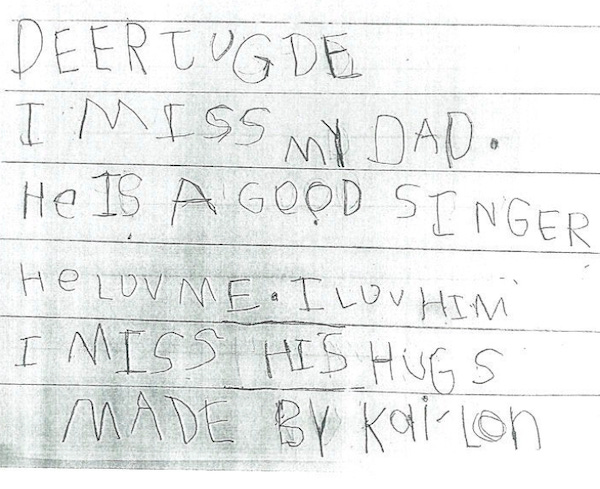 “I miss my dad. He is a good singer. He luv me. I luv him. I miss his hugs,” the boy wrote.