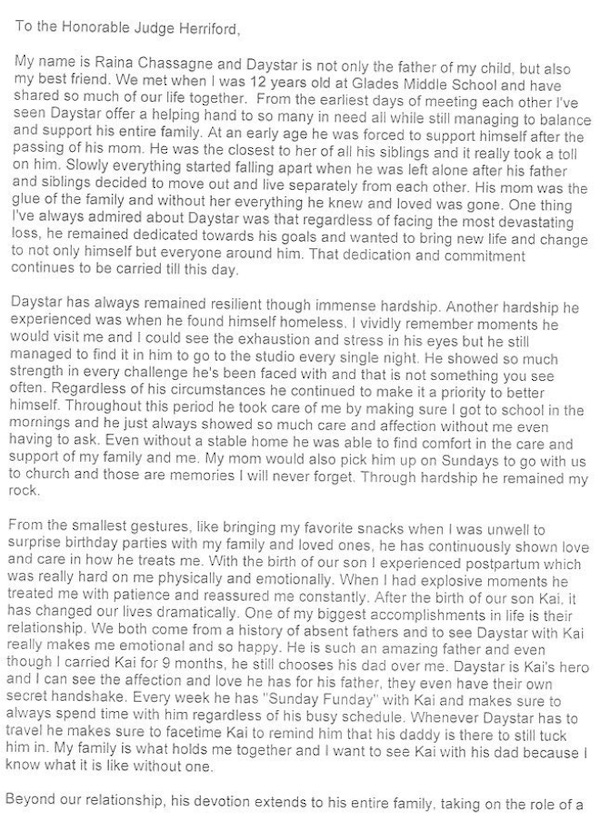 In her letter to the judge, Chassagne’s mother, Nancy Laguerre-Altenor, wrote that Raina’s father was killed when she was 18 months old and “my heart’s desire and my prayer was and still is that my grandchildren would not know the pain of not having their fathers around to guide them, protect them, provide for them, and love them.”