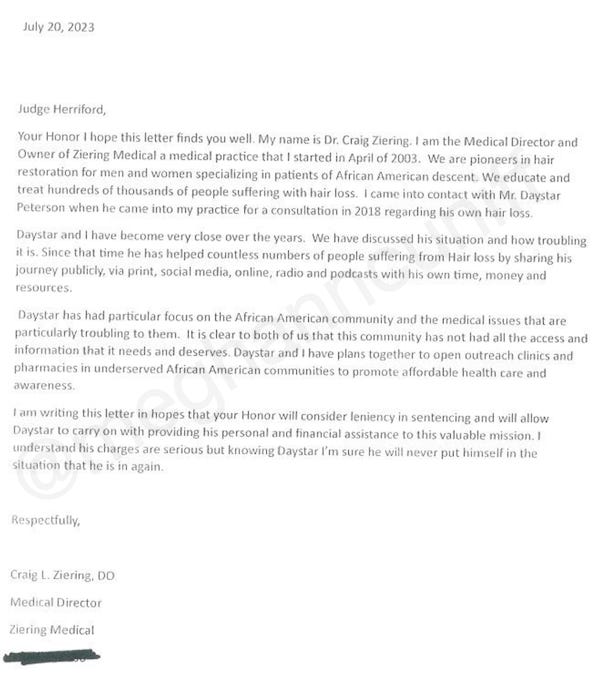 Lanez “has helped countless numbers of people suffering from Hair loss by sharing his journey publicly, via print, social media, online, radio and podcasts with his own time, money and resources,” according to Ziering’s letter.