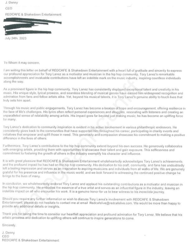 “We are genuinely grateful for his presence and influence in the music world, and we look forward to witnessing the continued positive change he brings to the lives of many,” Red Cafe wrote. “In conclusion, we wholeheartedly endorse Tory Lanez and applaud his outstanding contributions as a motivator and musician in the hip hop community. He embodies the essence of a true artist and serves as an influential figure in the industry, leaving an indelible impact on all who encounter his work. It is a genuine honor for us to bear witness to his incredible journey.”