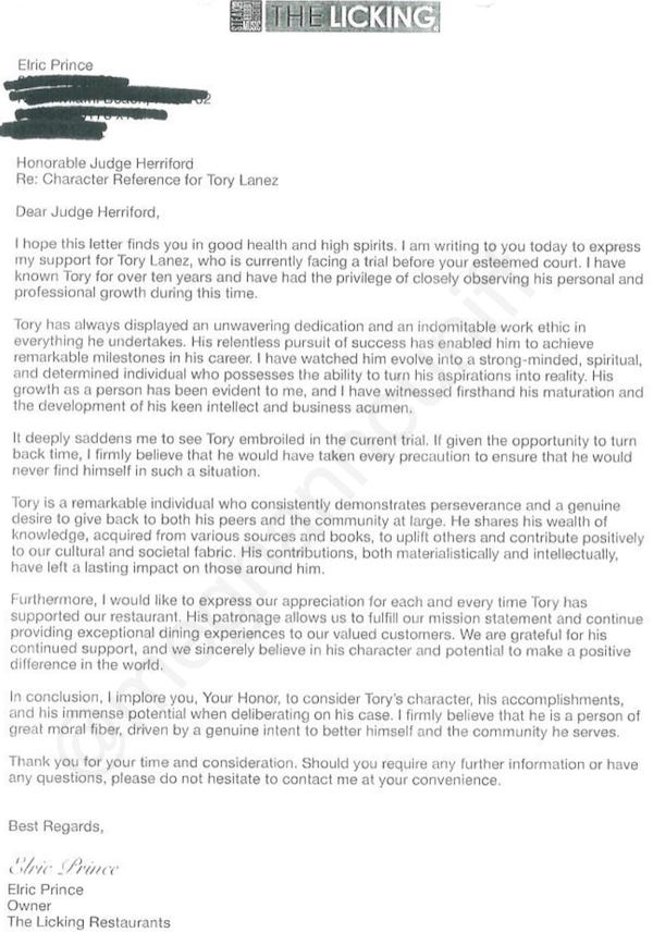 “It deeply saddens me to see Tory embroiled in the current trial. If given the opportunity to turn back time, I firmly believe that he would have taken every precaution to ensure that he would never find himself in such a situation,” Prince wrote.
