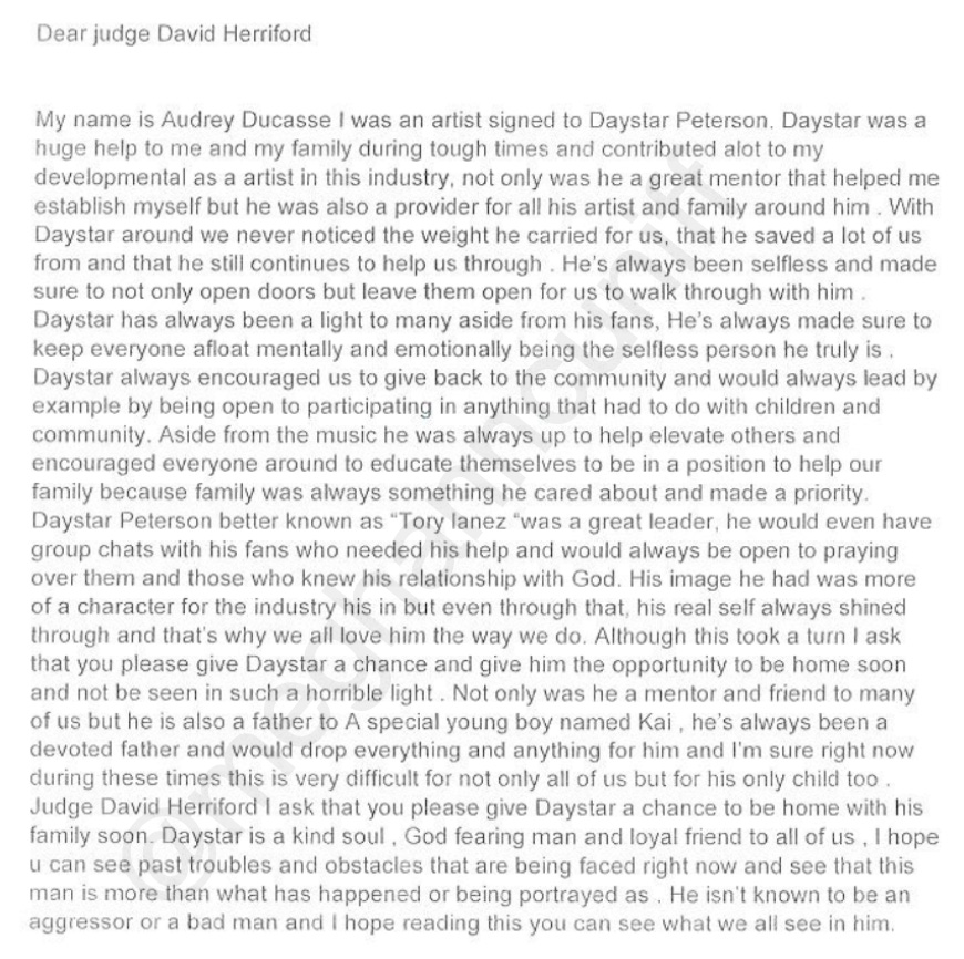 Melii, meanwhile, identified herself by her legal name, Audrey Ducasse, and said she “was an artist signed to Daystar Peterson,” which is Lanez’s legal name.