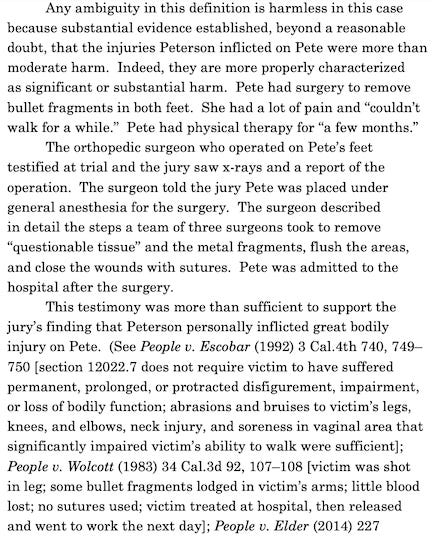 Egerton said Pete’s testimony about her pain and physical therapy, as well testimony from a surgeon who removed bullet fragments from Pete’s feet, “was more than sufficient to support the jury’s finding that Peterson personally inflicted great bodily injury on Pete.”