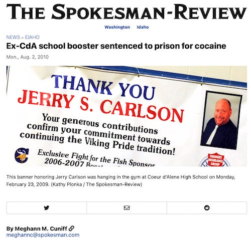 I was a reporter for The Spokesman-Review, and I knew the Coeur d’Alene school officials because I’d covered K-12 education out of the paper’s Coeur d’Alene bureau. It was the middle of the school day, so instead of picking up the phone, I drove to Coeur d’Alene High School, walked into the administration lobby and asked for the principal. Soon, I was telling him (to a shocked, shocked reaction) that Jerry Carlson had been arrested for cocaine distribution. Yes, the Jerry Carlson whose face is on a banner in the school gymnasium thanking him for his support. That Jerry Carlson.