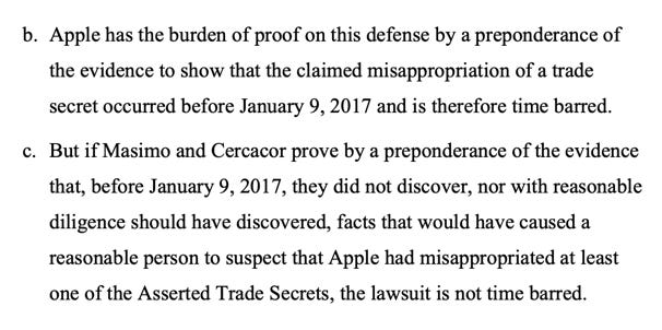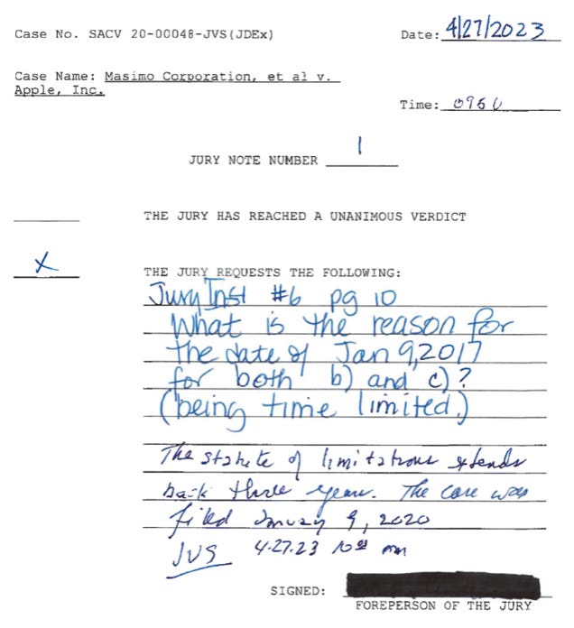 They asked their first question Thursday morning regarding the jury instruction on the statute of limitations, which Apple says Masimo missed but Masimo says it couldn’t have reasonably been expected to meet.