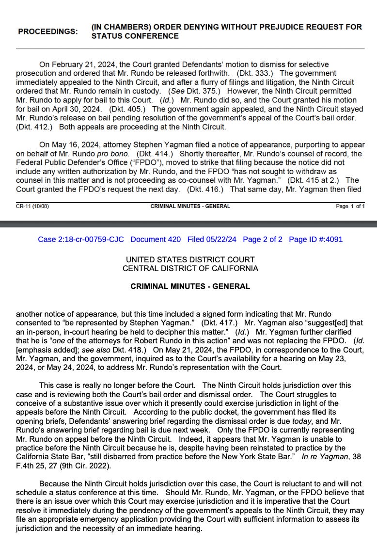 “Mr. Yagman re-confirmed with Mr. Rundo, in a face-to-face meeting at the MDCLA on the morning of May 17, that Mr. Rundo wishes Mr. Yagman to represent him in this action, as is indicated in the immediately-prior filing,” Yagman wrote. “Mr. Yagman does not now, nor has he ever, communicated via email. See Munoz v. Superior Court, 2022 WL 7150155, *2 (C.D. Cal. 2022) ("counsel [meaning Mr. Yagman] has every right not to use email except for filing and to communicate only by mail and phone . . . .").”