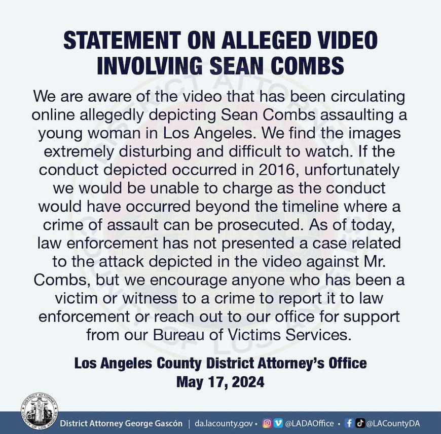 Diddy’s team hasn’t publicly acknowledged the new video, which was referenced in the Nov. 16 federal complaint from R&B singer Cassie, who is Diddy’s former longtime girlfriend and the woman assaulted in the video. UPDATE May 19: Diddy posted a video on social media. I discussed on LiveNOW: