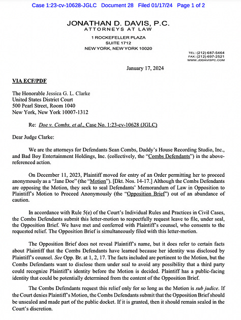 “The Opposition Brief does not reveal Plaintiff’s name, but it does refer to certain facts about Plaintiff that the Combs Defendants have learned because her identity was disclosed by Plaintiff’s counsel,” according to the letter, which refers to Diddy’s legal name, Sean Combs.