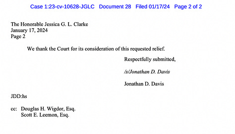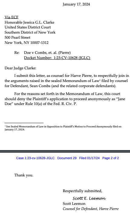Davis and his co-counsel, Anthony LoMonaco, along with Pierre’s lawyer first said they would file their opposition to the anonymity motion by Dec. 27. They secured a deadline extension to Jan. 17 after telling Judge Clarke it was needed “due to circumstances beyond the control of the Combs Defendants, which circumstances are of a confidential nature.”