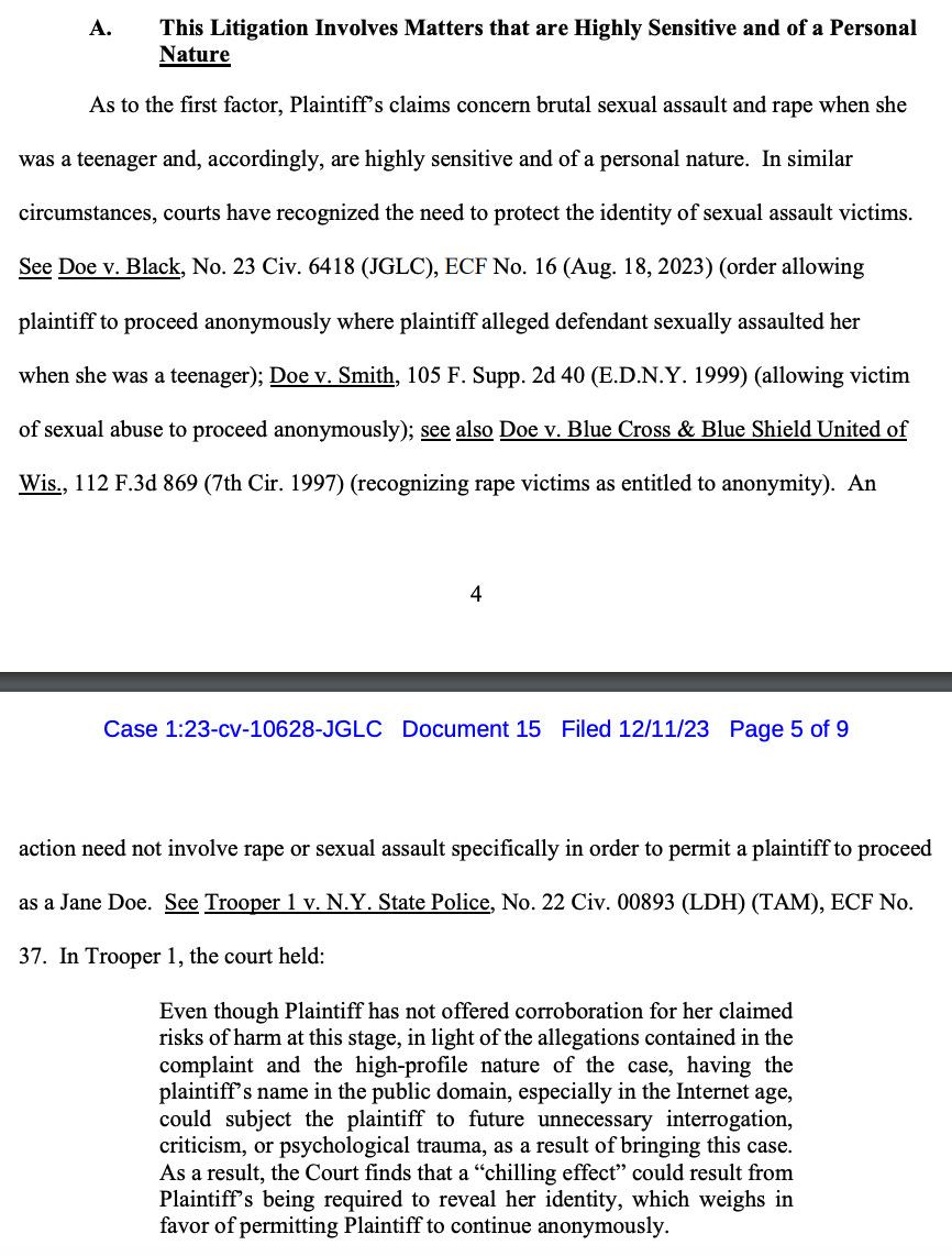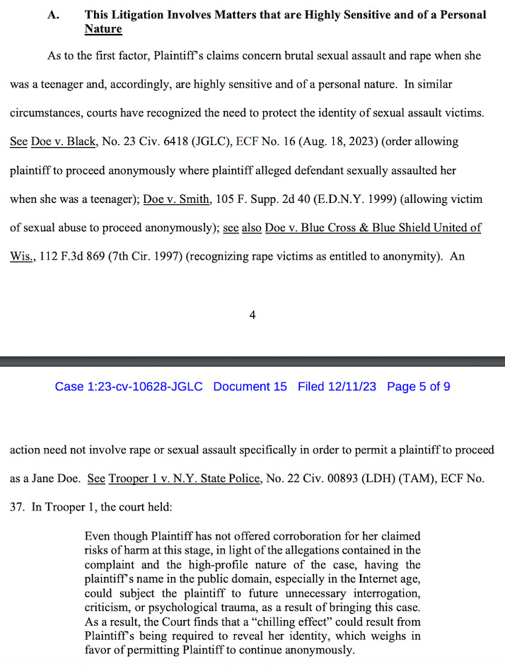 The first factor is that her claims “concern brutal sexual assault and rape when she was a teenager and, accordingly, are highly sensitive and of a personal nature,” the request says, citing four cases between 1997 and 2023.
