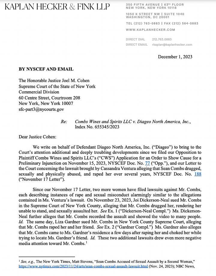In the weeks prior, Diageo’s lawyers had cited Cassie’s lawsuit and the accompanying “tsunami of negative media attention” in a letter to the judge that said “these public and disturbing accusations against Mr. Combs are already harming DeLeón by virtue of its association with Mr. Combs.”