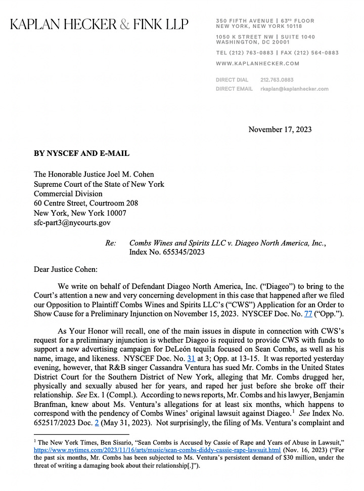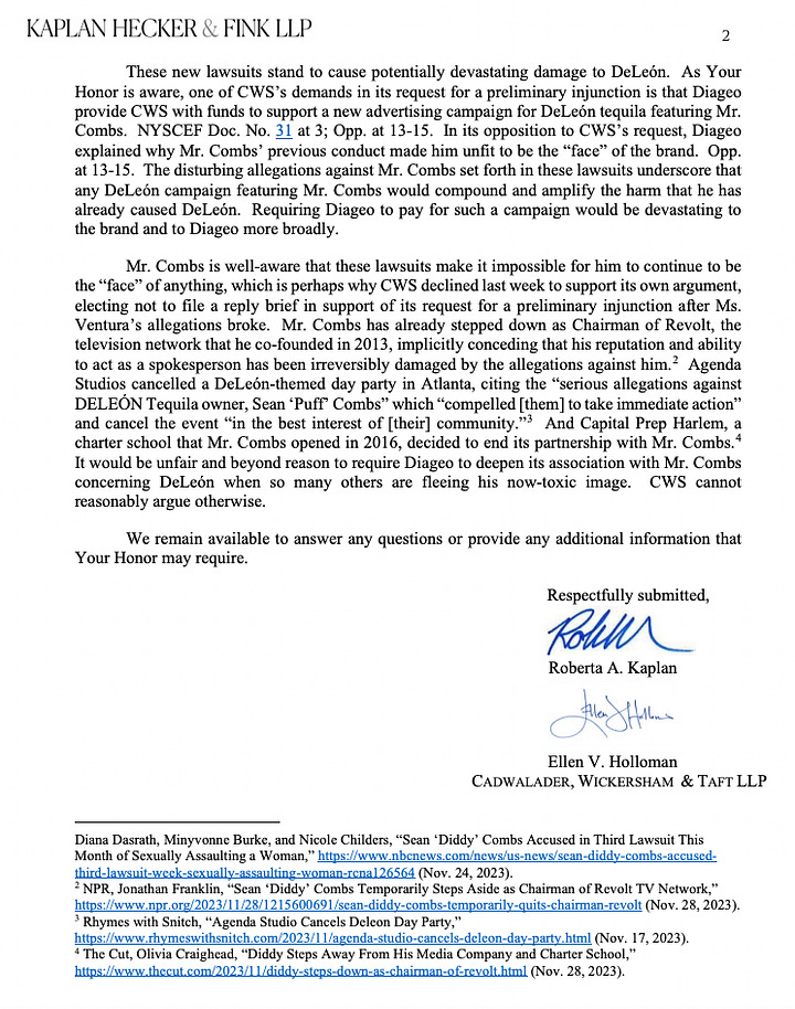 “For example, Diageo received an email from an influencer who partners with Diageo requesting to end her partnership with DeLeón, saying ‘morally [she] can not support’ DeLeón, since it ‘is associated with’ Mr. Combs, in light of the ‘very triggering’ accusations made by Ms. Ventura,” according to the Nov. 17 letter from Kaplan Hecker & Fink LLP. “Requiring DeLeón to feature Mr. Combs as the face of the DeLeón brand under these circumstances, as CWS asks this Court to enjoin Diageo to do, would only compound that harm, potentially causing devastating and permanent damage to the brand.”