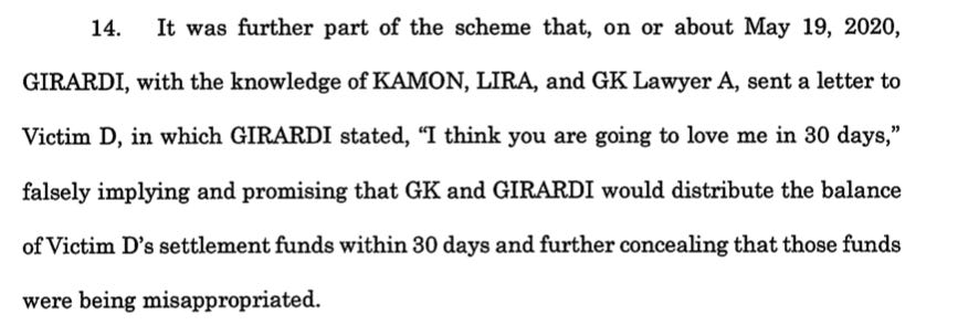 Meanwhile, Kamon’s five new wire fraud charges with Girardi in California involve amounts between $15,000 and $4 million, but the indictment puts the total amount stolen by Girardi and Kamon at “in excess of” $15 million. Further, while Estrada said at the presser said Girardi embezzled “tens of millions,” the description of the settlements at issue - particularly the $53 million settlement passed off as $7.25 million - indicates an amount far greater than $15 million.