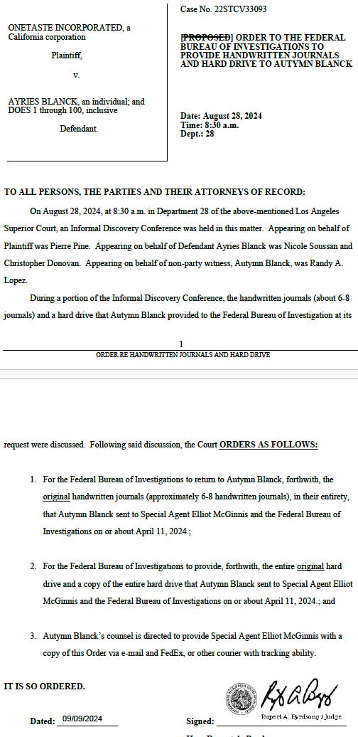 Last fall, Los Angeles County Superior Court Judge Rupert Byrdsong ordered the FBI to return the original journals to Blanck to ensure the company’s lawyers can access them for the civil litigation.