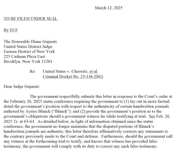 The attorneys said the government “did not live up to its obligations to do due diligence on its witnesses’ false claims before presenting her testimony; rather, it repeatedly took Blanck’s word for it that the journals were authentic, even after the defense presented concrete evidence in December 2024 that they were not.”