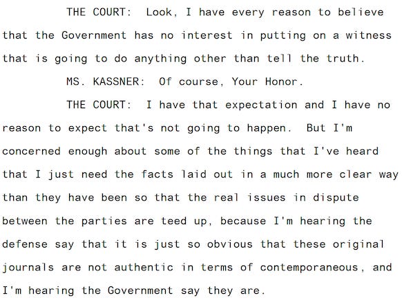 That’s when Judge Gujarati ordered prosecutors to file a brief detailing their explanation for the journals “because I’m hearing the defense say that it is just so obvious that these original journals are not authentic in terms of contemporaneous, and I’m hearing the Government say they are.”