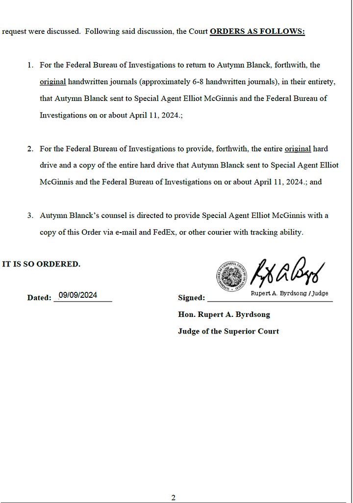 Byrdsong issued a written order telling the FBI to return the journals, the original hard drive and a copy of the hard drive “that Autymn Blanck sent to Special Agent Elliot McGinnis and the Federal Bureau of Investigations.”