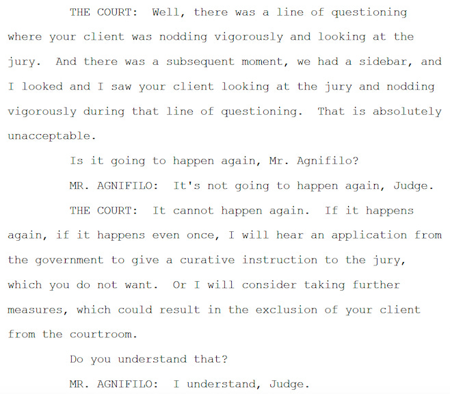“He was reacting to the witness on the stand. That being said, we’ve addressed it. But I also want the court to know how seriously we take these things,” Agnifilo said.