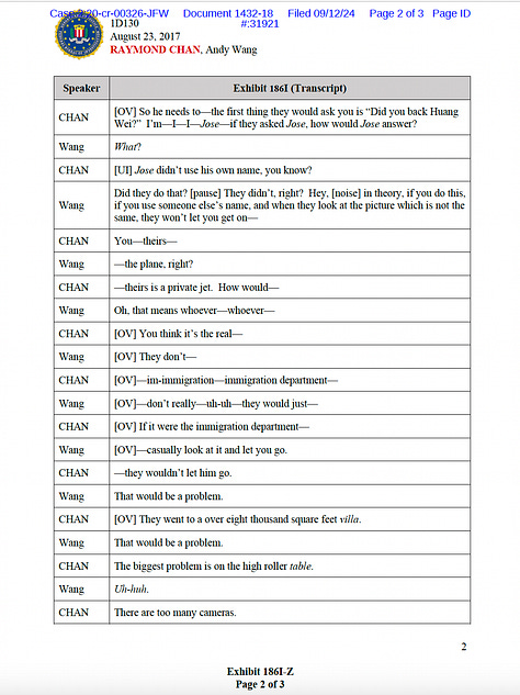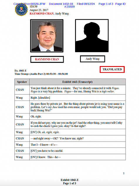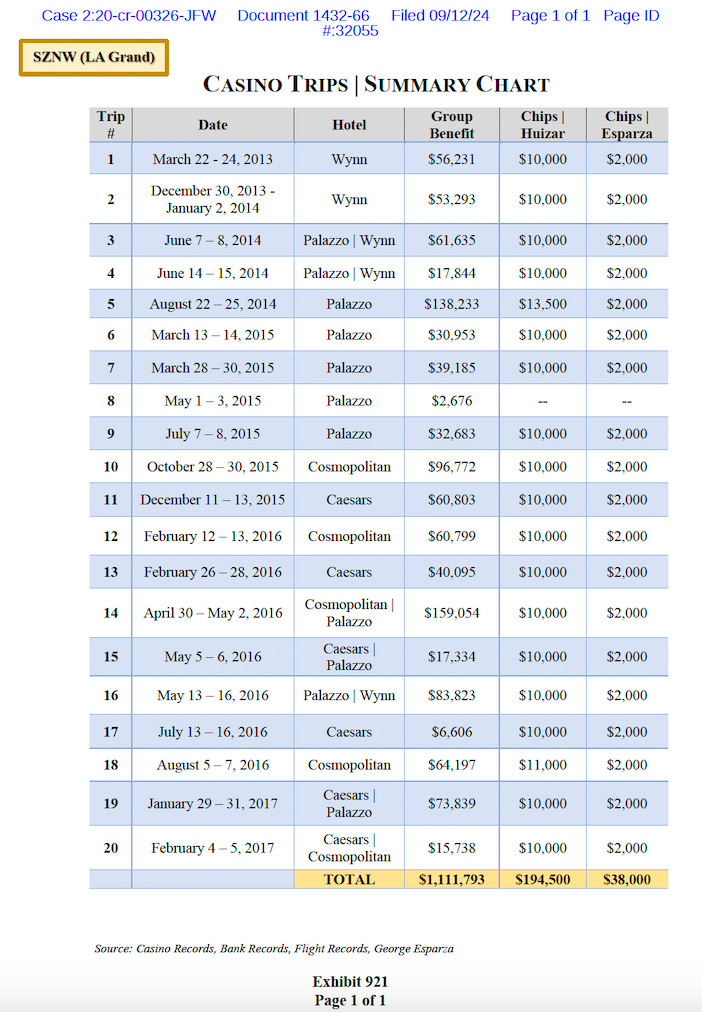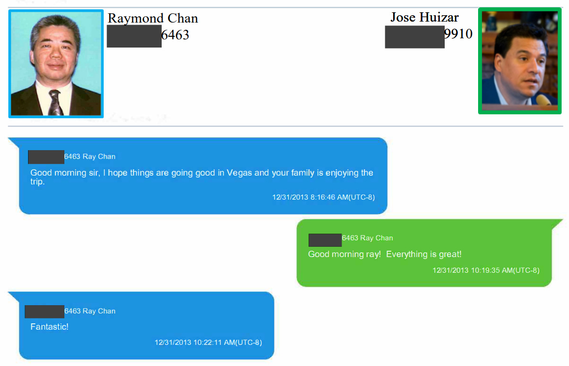 The jurors who convicted Chan in March saw text messages from Dec. 31, 2013, in which Chan wrote Huizar, “Good morning sir, I hope things are going good in Vegas and your family is enjoying the trip.” They also heard a covertly recorded phone call from 2017 between Chan and friend-turned-prosecution witness Andy Wang in which Chan discussed the federal investigation into Huizar and said “they’ve already connected it with Vegas” and “Vegas is a very big problem.”