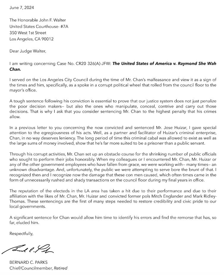 Former Los Angeles City Councilman and Police Chief Bernard Parks told Judge Walter that Chan “in no way deserves leniency.”