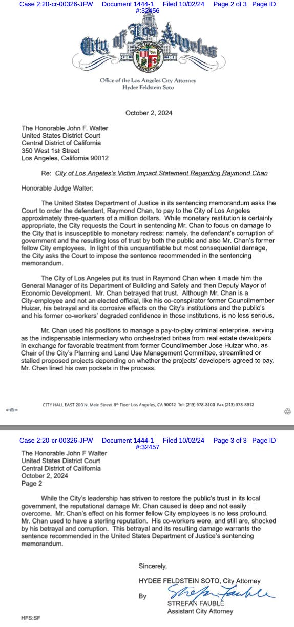 “While the City’s leadership has striven to restore the public’s trust in its local government, the reputational damage Mr. Chan caused is deep and not easily overcome. Mr. Chan’s effect on his former fellow City employees is no less profound. Mr. Chan used to have a sterling reputation. His co-workers were, and still are, shocked by his betrayal and corruption,” Fauble wrote in a letter to Judge Walter.