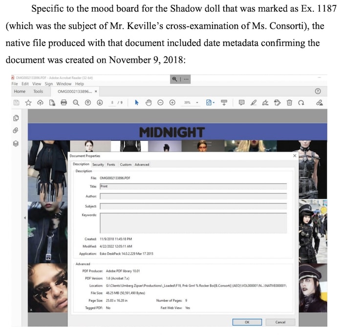 Keville brought up the metadata last week during his questioning of Blanche Consorti, MGA’s former creative director who designed many of the 31 dolls. He said an image of a doll design board presented to jurors during Consorti’s direct-exam lacked the data — implying the image was created solely for the case — but Selna cut off the questioning because it lacked foundation.