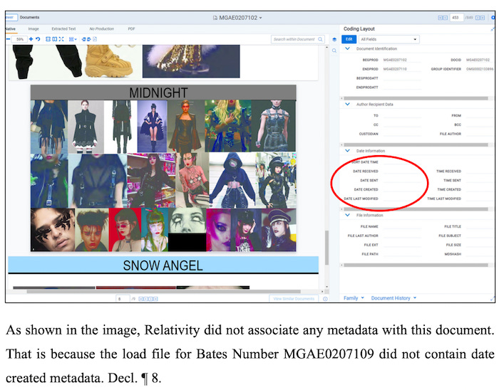 “While the OMG Girlz agree based on a review tonight that the native PDF contains metadata, the document review platform is not able to extract that metadata so it showed no associated metadata—as it was produced by MGA,” Keville wrote. “That is what counsel relied on…as the review platform is typically accurate.”