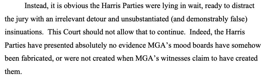 Scolnick tried to question Consorti about the issue during re-direct on Tuesday, asking, “Are you aware that the Harrises are now apparently contending that your mood boards have been tampered with?”