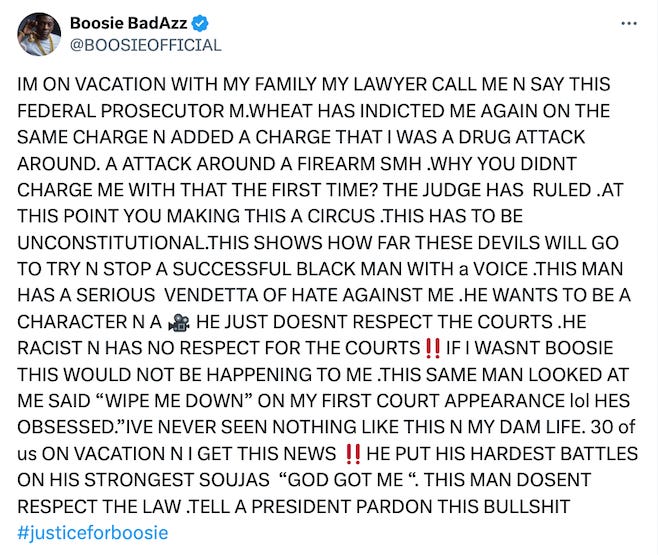 Then on May 9, the 9th Circuit issued the Duarte ruling, triggering the dismissal motion that the judge granted on July 12. Wheat did not attend the hearing, and he’d spent the several months in Hawaii trying a major public corruption case that ended in a full acquittal for all defendants. But he never withdrew from Boosie’s case, and on Wednesday, he filed a notice of appearance in Boosie’s new case.