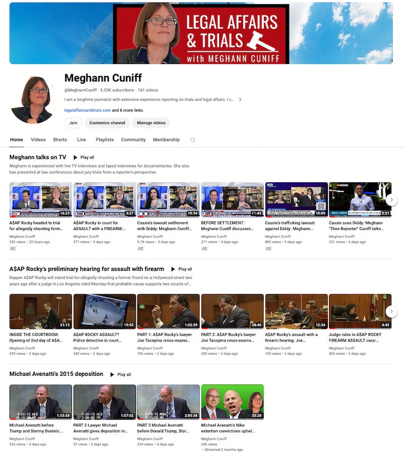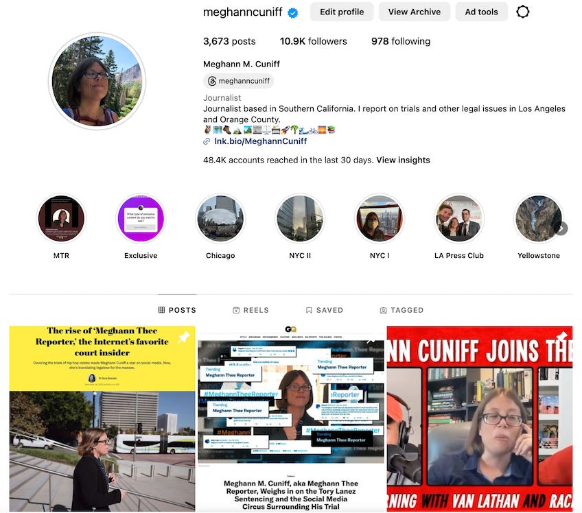 The purpose of all my social media is to drive traffic to my YouTube channel and to Legal Affairs and Trials with Meghann Cuniff while building my national and international presence as a legal affairs journalist who reports from courtrooms, not Law & Crime Network livestreams.