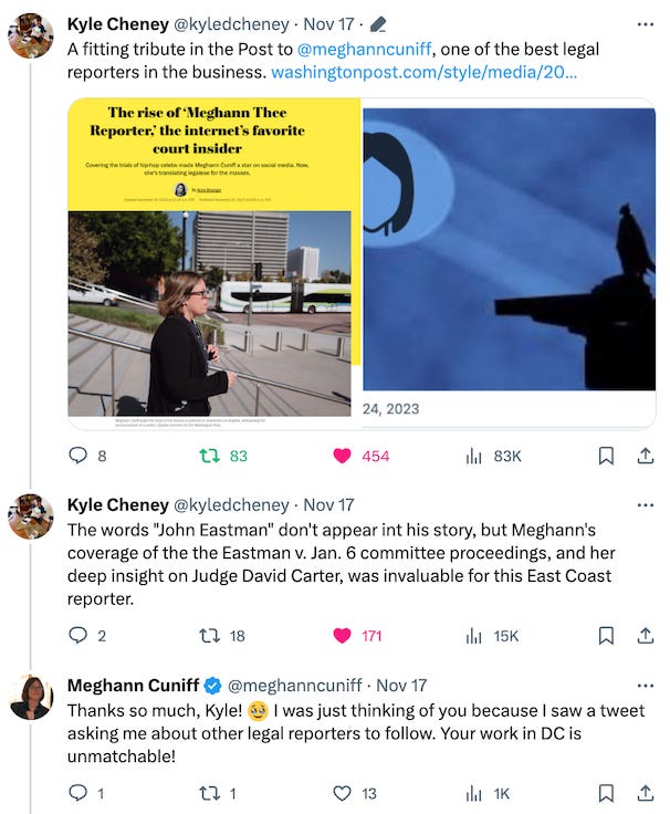I’m so thankful for all the kind words from my colleagues who’ve shared the piece, including ace Politico reporter Kyle Cheney. Kyle and I met through the platform formerly known as Twitter during our coverage of Donald Trump’s former lawyer John Eastman’s legal effort to stop Chapman University from releasing his emails to the January 6th Committee.