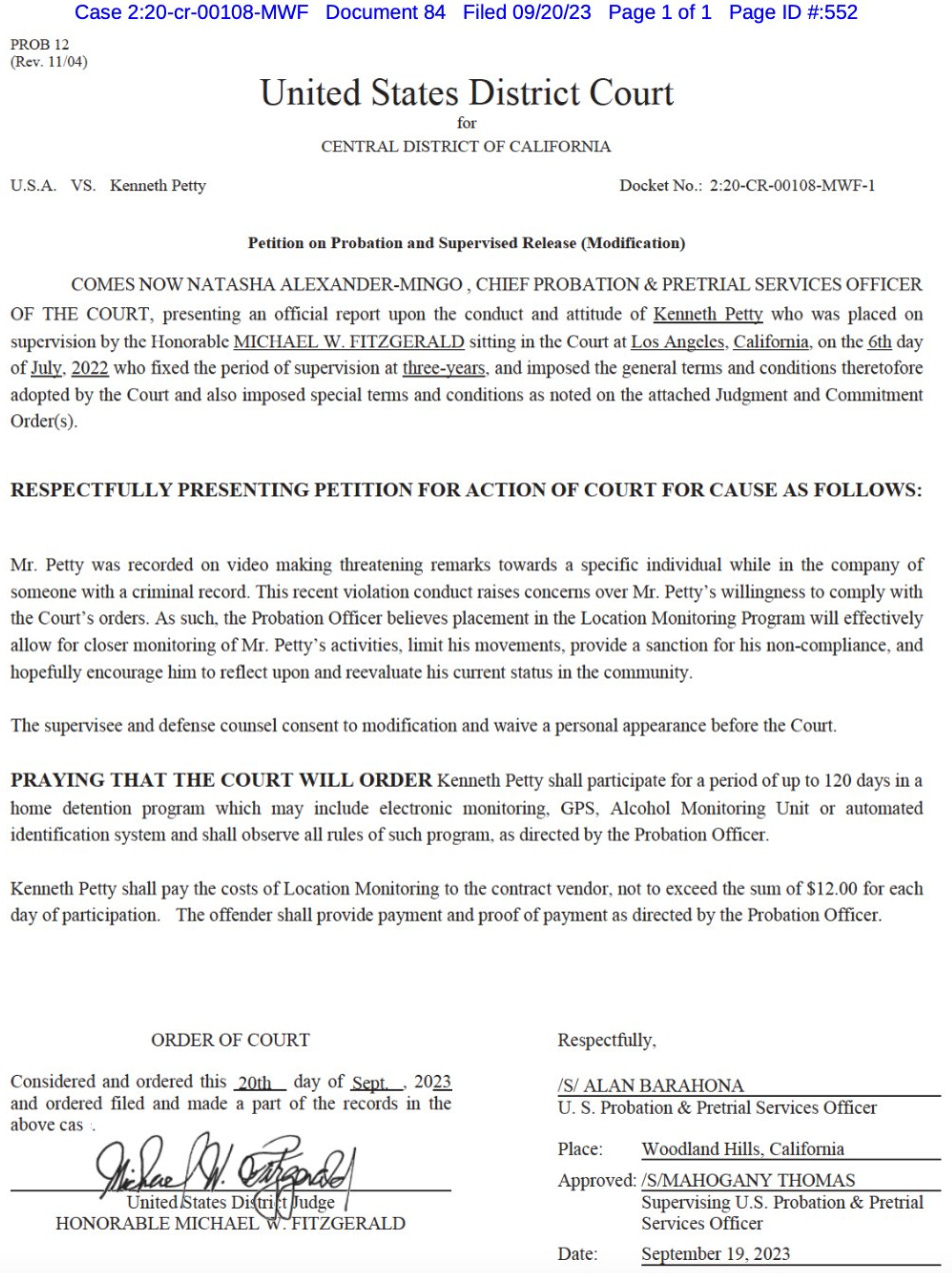 Currently, Petty is on house arrest under an agreement with the U.S. Probation Office approved by U.S. District Judge Michael Fitzgerald of the Central District of California in Los Angeles in September. He’s been on federal probation since pleading guilty in 2021 to failing to register as a sex offender.